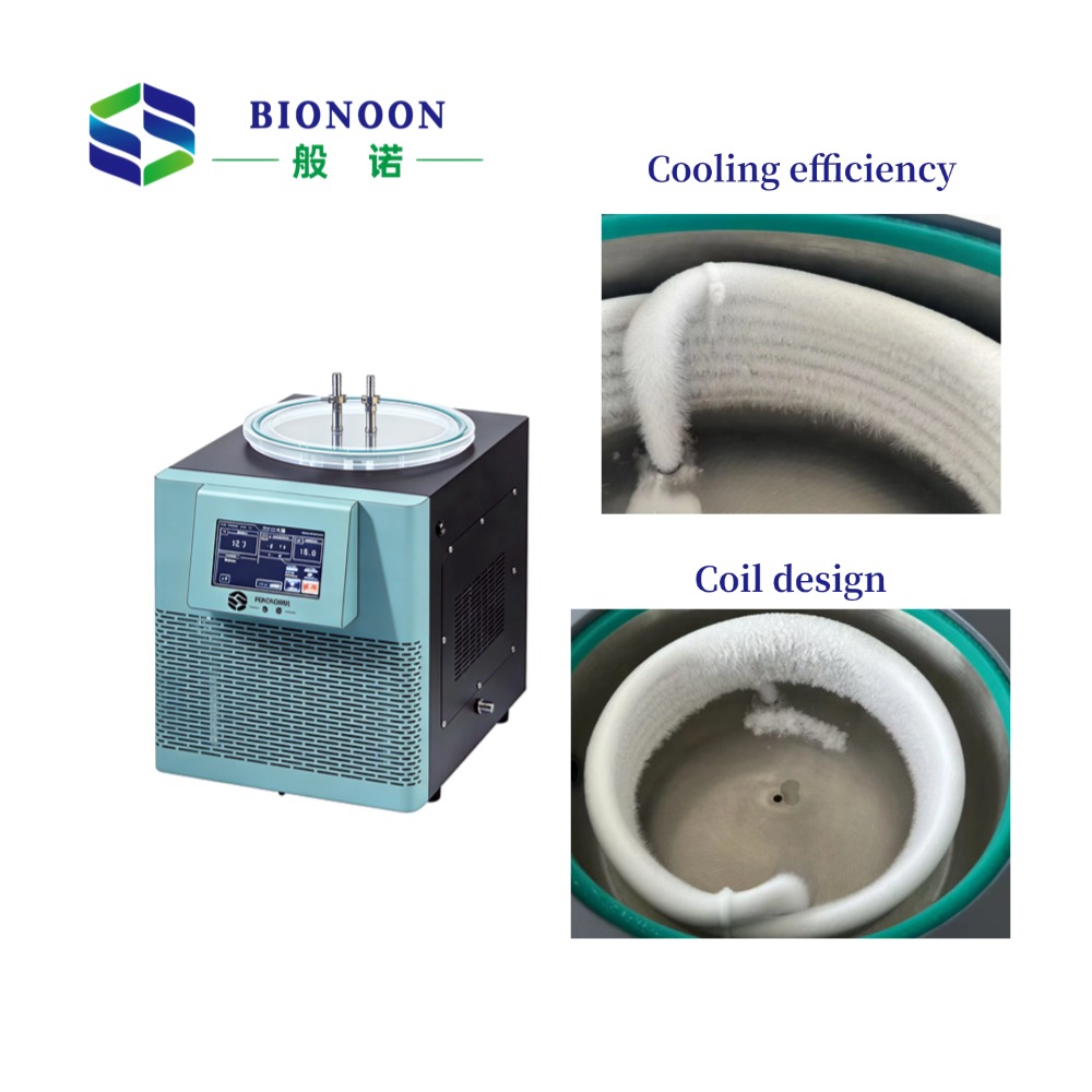 The BIONOON-80D6 Ultra-Low Temperature Cold Trap from Shanghai Bionoon is a new type of high-efficiency solvent recovery device. It is used to condense solvent vapor and recover solvents, especially organic solvents. The cold trap can significantly improve the efficiency of the vacuum concentration system: the reduction of vapor increases the vacuum degree of the system, thereby accelerating the concentration process.